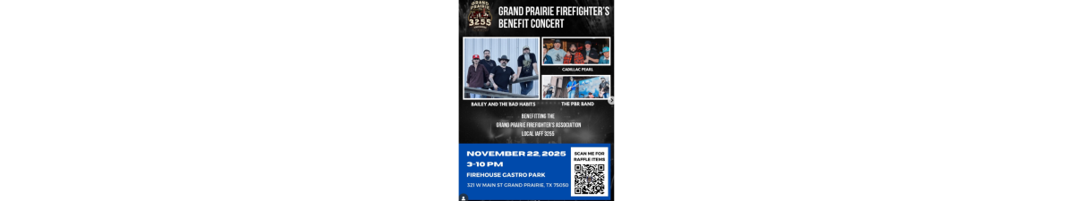 Join Grand Prairie Fire Department Hearts and Hoses for their 5th annual Grand Prairie Firefighters Benefit Concert! Bailey and the Bad Habits, The PBR Band and Cadillac Pear will be performing. This will be Benefitting the Grand Prairie Firefighter's Association Local IAFF 3255. There will be a raffle!